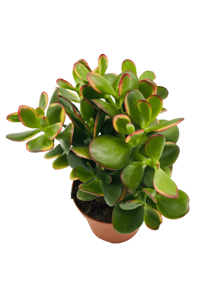 - Appearance: Crassula ovata has thick, fleshy, oval-shaped leaves that are typically dark green but may have red or burgundy edges under certain conditions. The leaves are arranged in opposite pairs along the stems and often have a glossy texture. Over time, mature plants may develop a thick, woody stem and a tree-like growth habit.