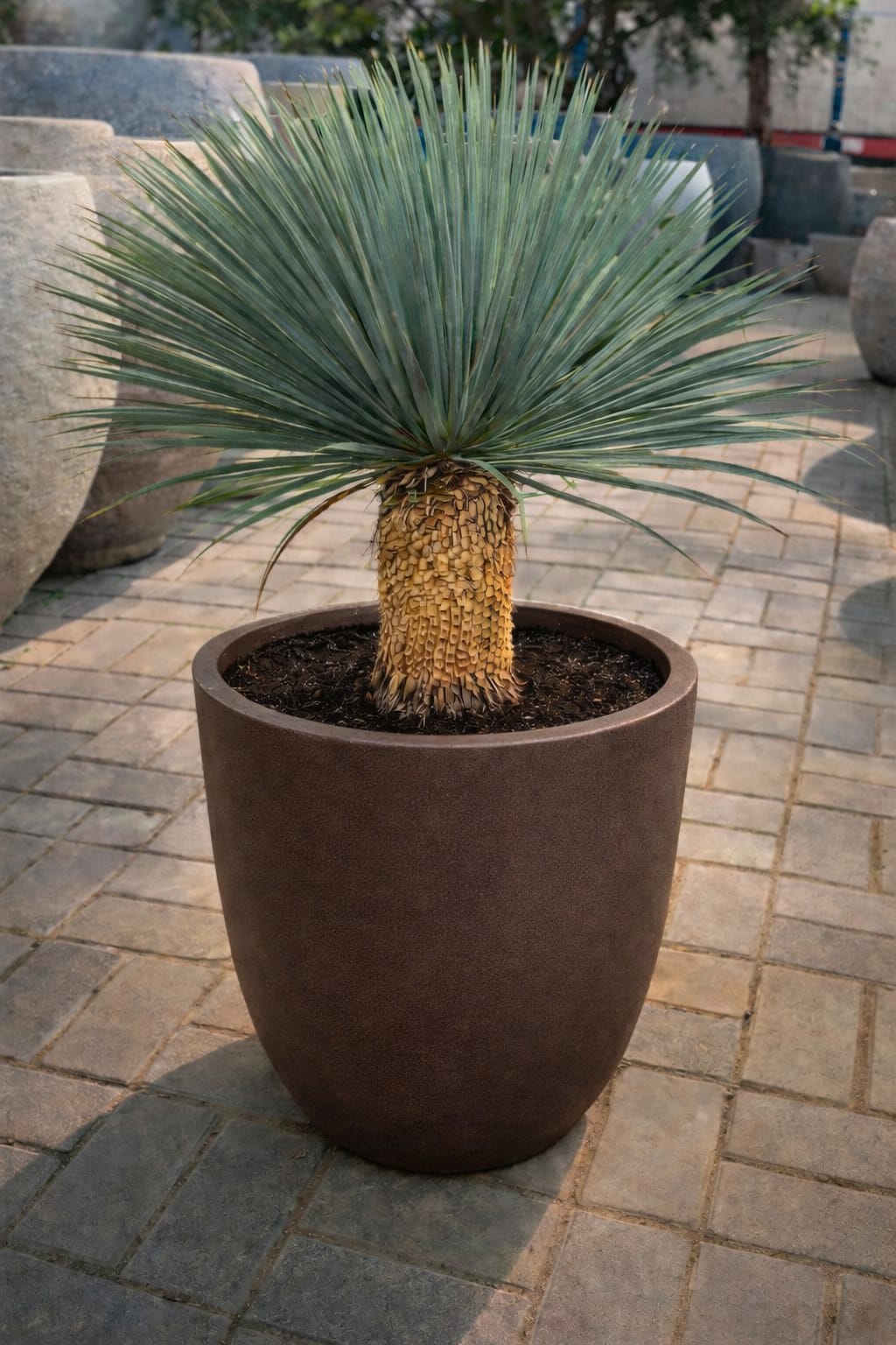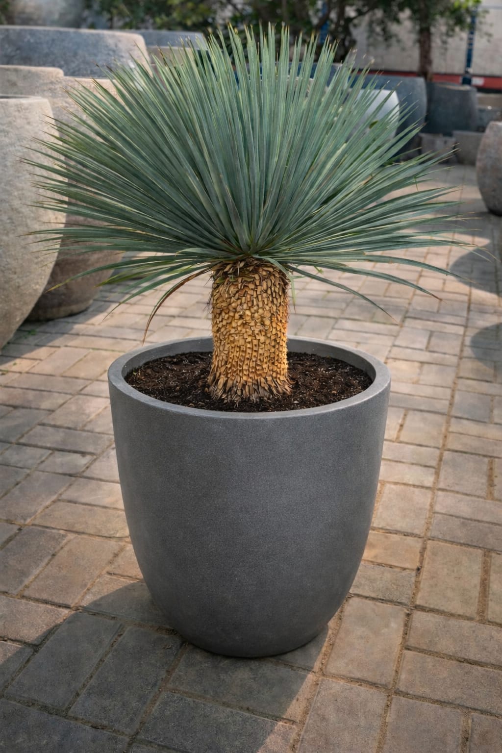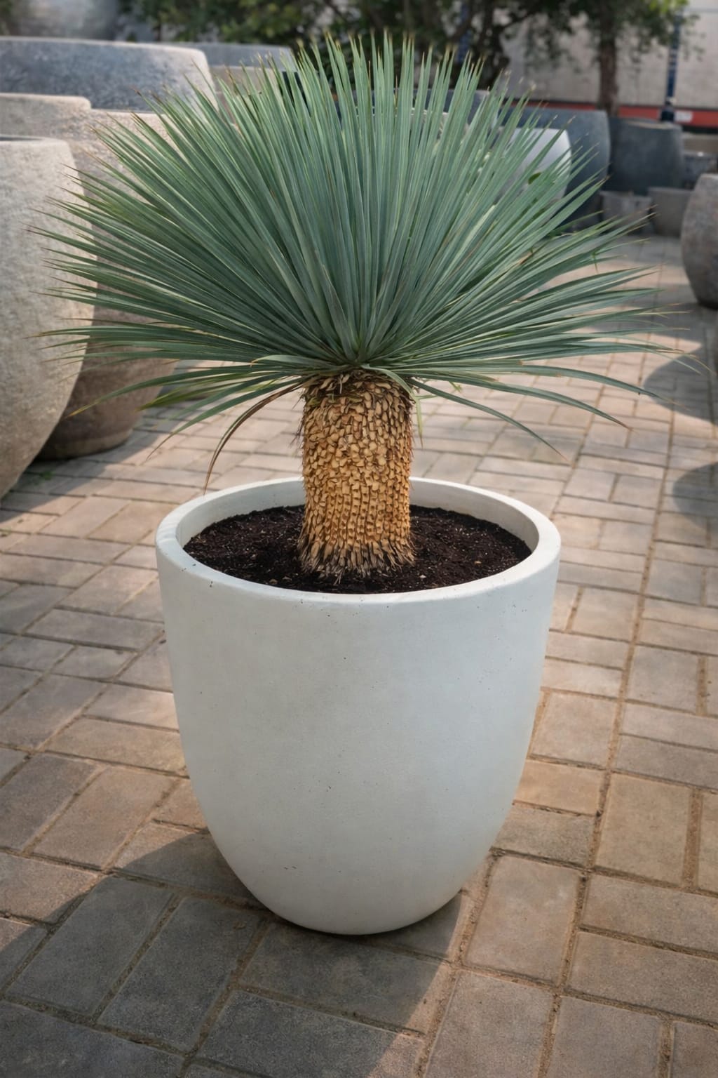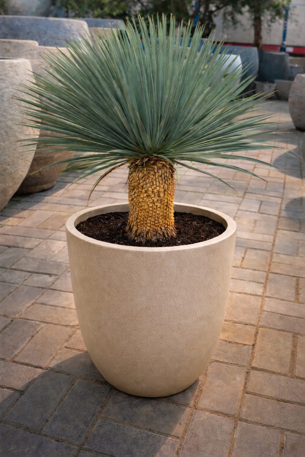 This yucca species is characterized by its striking blue-green, narrow leaves that radiate symmetrically from a central point, forming a dense rosette. The leaves are stiff, sword-shaped, and have sharp tips, giving the plant a distinctive appearance. Yucca rostrata typically grows as a single trunked plant, with the trunk covered in old leaf bases that persist over time.